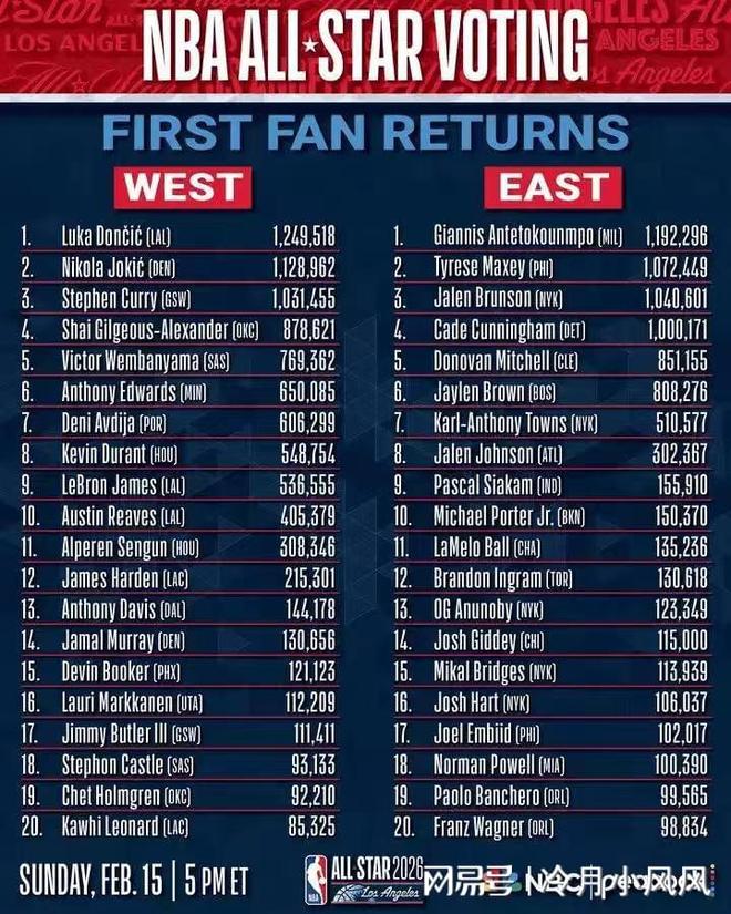 需要注意的是,联盟今年的投票规则有了不小的变化,除了全明星首发还是采取50%球迷投票+各25%的球员投票和媒体投票外,取消了前场和后场位置取分。按照第一轮的投票情况来看,詹姆斯落后的比较多,想在后两轮发奋狂追、冲进西部所有球员前五难度非常大。而且即便真的完成反超,但是以詹姆斯本赛季的出勤率和数据表现,也很难获得媒体和球员的青睐。换句话说,詹姆斯想入选全明星首发的可能性微乎其微。
