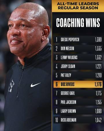 凭借这场胜利,里弗斯取得了NBA执教生涯的第1176场胜利,正式超越传奇教练乔治-卡尔,升至联盟历史常规赛胜场榜第六位。