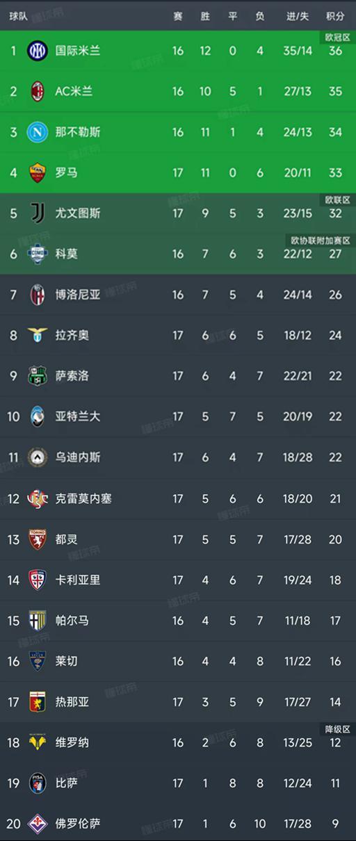 北京时间12月30日,随着罗马3-1战胜热那亚,意甲第17轮的比赛全部结束,我们一起看看最新积分榜变动!