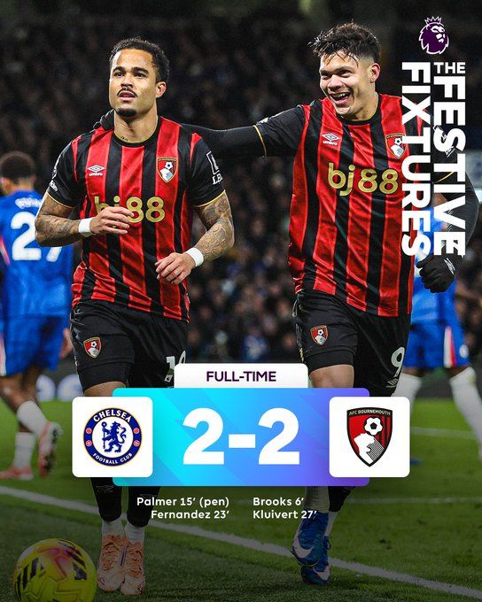北京时间12月31日03:30,英超联赛第19轮,切尔西坐镇斯坦福桥球场迎战伯恩茅斯。上半场,布鲁克斯首开纪录,随后埃斯特旺造点,帕尔默点射破门,恩佐反超,克鲁伊维特扳平。切尔西半场2-2战平伯恩茅斯。下半场双方均无建树。最终切尔西2-2战平伯恩茅斯,切尔西近7轮仅取得1场胜利。