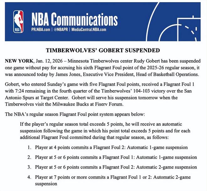 北京时间1月13日,NBA官方宣布,明尼苏达森林狼队中锋戈贝尔因在2025-26赛季常规赛中恶意犯规积分累计达到6分,将被无薪禁赛一场。此次禁赛将让戈贝尔损失201149美元的薪水。森林狼队也将因此获得100575美元的奢侈税差额抵免。